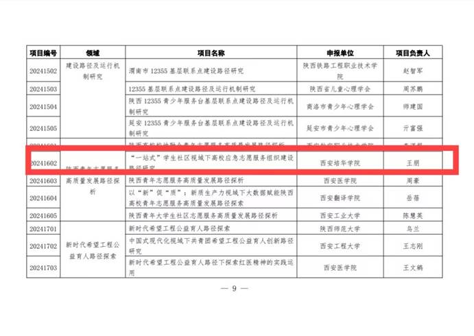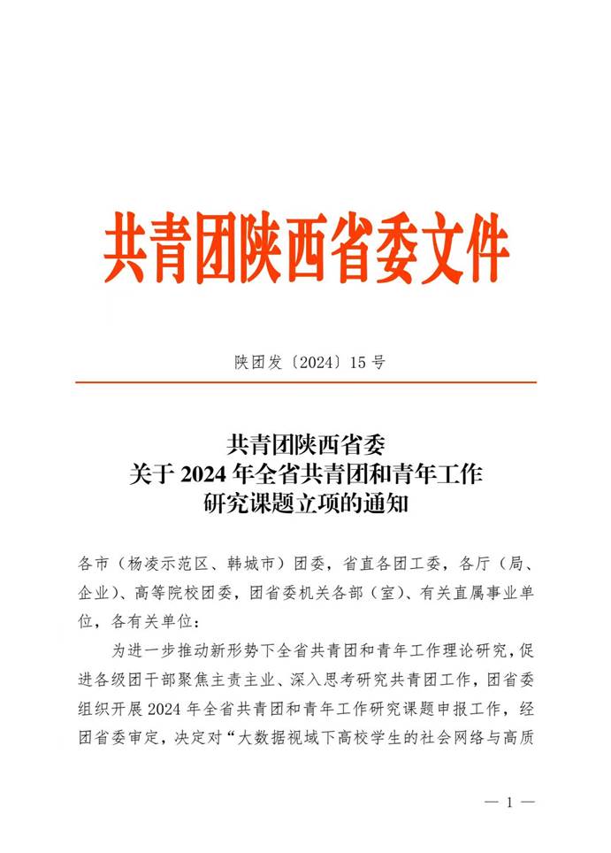 日前,共青团陕西省委发布《关于2024年全省共青团和青年工作研究课题立项的通知》(陕团发〔2024〕15号),我校2个项目获批立项。
