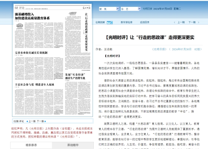 7月30日,光明日报二版“光明时评”栏目刊发我校教师王法能副教授理论文章《让“行走的思政课”走得更深更实》。文章视野广阔、既有理论深度又有实践导向,深刻思考总结了实践育人的理论逻辑和路径方法。