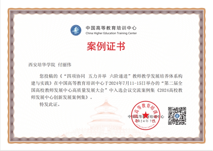 2024年7月,由中国高等教育学会指导,中国高等教育培训中心主办的“第二届全国高校教师发展中心高质量发展大会”在吉林长春成功举办。在会议开展的高校教师发展中心创新发展案例征集活动中,学校提交的案例“西安培华学院“四项协同 五力并举 六阶递进”教师教学发展培养体系构建与实践”入选《2024高校教师发展中心创新发展案例集》(简称《案例集》)。