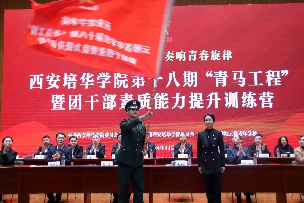 随后,云梯青年学校名誉校长姚文静为西安培华学院云梯青年学校第十八期“青马工程”暨团干部素质能力提升训练营授旗,临时团工委纪律委员王真浩接旗。