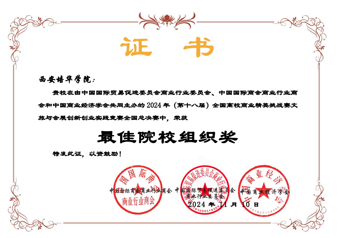 近日,第十八届全国高校商业精英挑战赛文旅与会展创新创业实践竞赛全国总决赛圆满落幕。经过激烈比拼,学校获国家级二等奖4项,国家级三等奖3项,西安培华学院荣获最佳院校组织奖,8位老师获最佳指导教师奖。