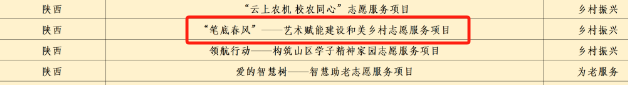 11月30日至12月1日,第七届中国青年志愿服务项目大赛全国赛终评在广东汕头举办,本次大四共有1001个项目入围终评。经过评审,西安培华学院传媒与设计学院“笔底春风——艺术赋能建设和美乡村志愿服务项目”荣获第七届中国青年志愿服务项目大赛铜奖。