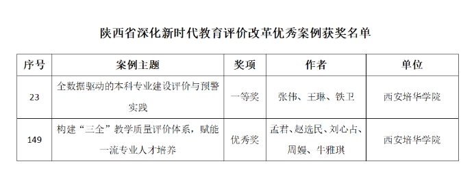 近日,中共陕西省委教育工委、陕西省教育厅下发《关于全省深化新时代教育评价改革优秀获奖案例的通报》(陕教工函〔2024〕346号)文件,西安培华学院报送的《全数据驱动的本科专业建设评价与预警实践》案例获评一等奖,《构建“三全”教学质量评价体系,赋能一流专业人才培养》案例获评优秀奖,展现了学校在教育评价改革领域积极探索取得的成效。