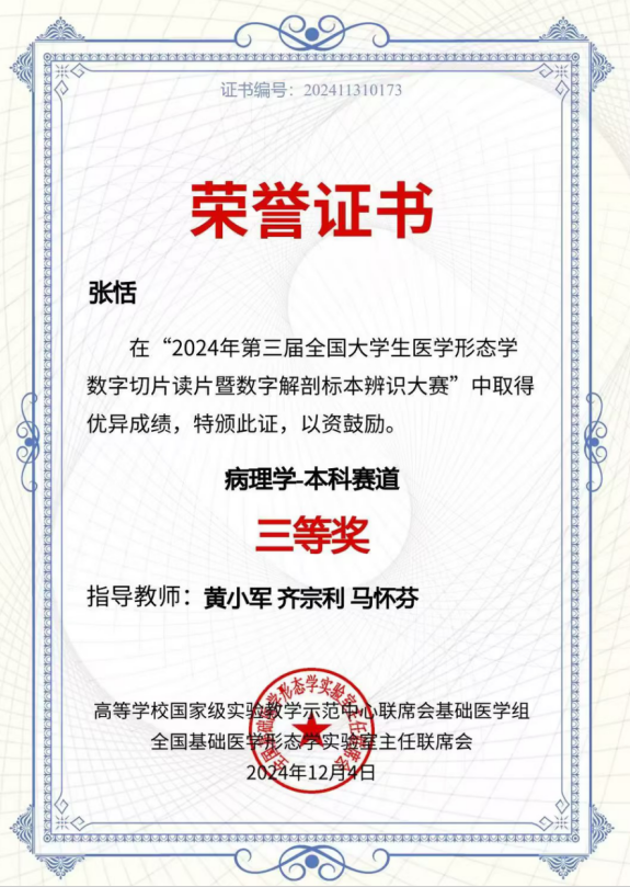 在黄小军、齐宗利老师的精心指导下,张恬同学凭借扎实的专业知识、严谨的科学态度和出色的实践能力,在比赛中脱颖而出。在病理学本科赛道的角逐中,她准确地辨识了数字切片和解剖标本,对各种病理变化进行了深入分析和准确判断,展现了出色的专业素养和竞技水平。