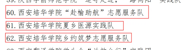其中,西安培华学院荣获省级示范学校,学校“赴榆助航”志愿服务队、夏乡医源实践队、乡约筑梦志愿服务队荣获省级优秀团队,人文与国际教育学院老师朱林鹏、培华学子高正扬和崔誉文获省级先进个人。