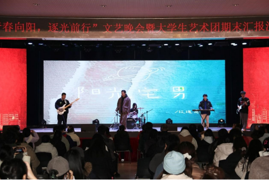 本次文艺演出的节目有大学生艺术团电声乐队带来的《阳光宅男》《日不落》、凤凰舞蹈团街舞队的《向阳而生》、声乐队的男声二重唱《无名的人》、女声四重唱《有我》及男女对唱《我们的明天》等。