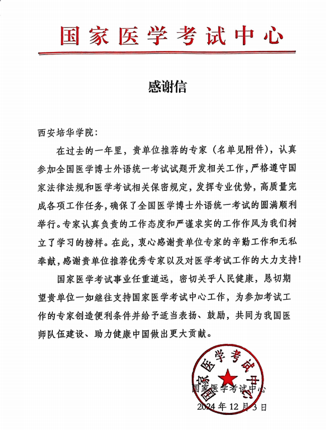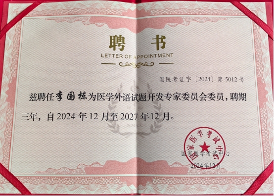 近日,国家医学考试中心发来聘书,续聘学校人文与国际教育学院外语系主任李国栋教授担任医学外语试题开发专家委员会委员,同时向培华发来感谢信,为学校在过去一年中对全国医学博士外语统一考试试题开发工作的鼎力支持表示感谢。