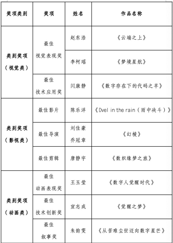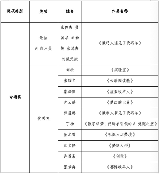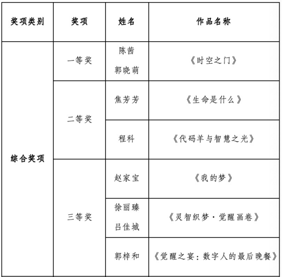 陈茜、郭晓萌作品《时空之门》获一等奖,焦芳芳作品《生命是什么》、程科作品《代码羊与智慧之光》获二等奖,赵家宝作品《我的梦》、徐丽臻、吕佳城作品《灵智织梦·觉醒画卷》、郭梓和作品《觉醒之宴:数字人的最后晚餐》获三等奖。