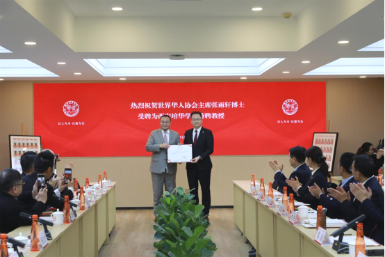 姜波理事长为世界华人协会主席张雨轩博士颁发聘书