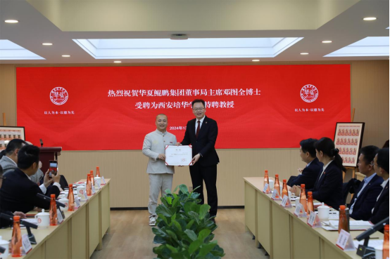 随后,举行了特聘教授聘任仪式和合作签约仪式。姜波理事长向邓图全博士颁发了特聘教授聘书,还为他佩戴了培华校徽,邓图全博士表达了对学校信任与认可的肯定,并表示将以“培华人”的新身份为学校发展作贡献、建新功。