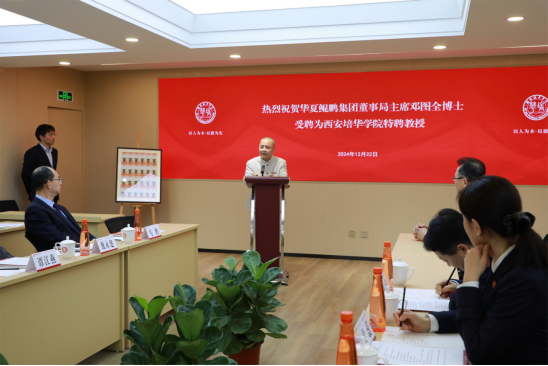 华夏鲲鹏集团董事局主席邓图全博士表示,非常荣幸受聘为培华特聘教授,并对姜波理事长的信任表示感谢。他讲到,产教融合不仅有助于提升高校的教育质量和学生的实践能力,还能促进企业的技术创新和产业升级。通过高校与企业之间的紧密合作,可以实现资源共享、优势互补,共同推动区域经济社会的发展。希望双方能积极推进产教融合、优化专业设置、创新教学内容,力争将“华夏鲲鹏信创产业学院”打造成为校企合作、产教融合的标杆示范工程,并在全国推广复制,创造更大的经济社会价值。