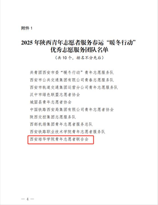 近日,共青团陕西省委公布2025年陕西青年志愿者服务春运“暖冬行动”工作的通报,西安培华学院青年志愿者协会荣获2025年陕西青年志愿者服务春运“暖冬行动”优秀志愿服务团队,6名培华学子荣获2025年陕西青年志愿者服务春运“暖冬行动”优秀志愿者。