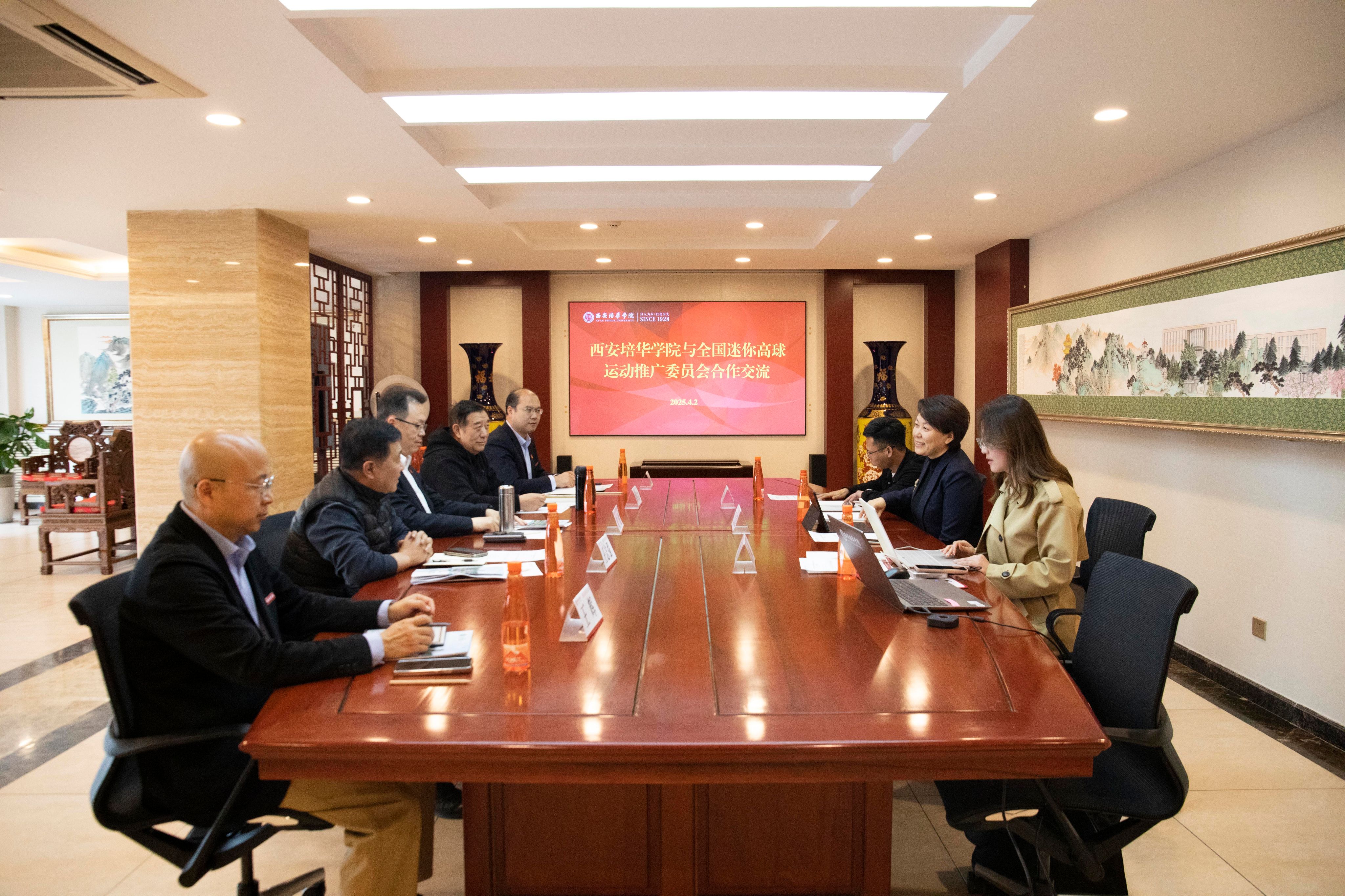 4月2日下午,西安培华学院与全国迷你高球运动推广委员会召开合作交流座谈会。苏州智击体育董事长王志慧、培华学院理事长姜波及体育学院负责人等参会,围绕迷你高球项目落地展开研讨。