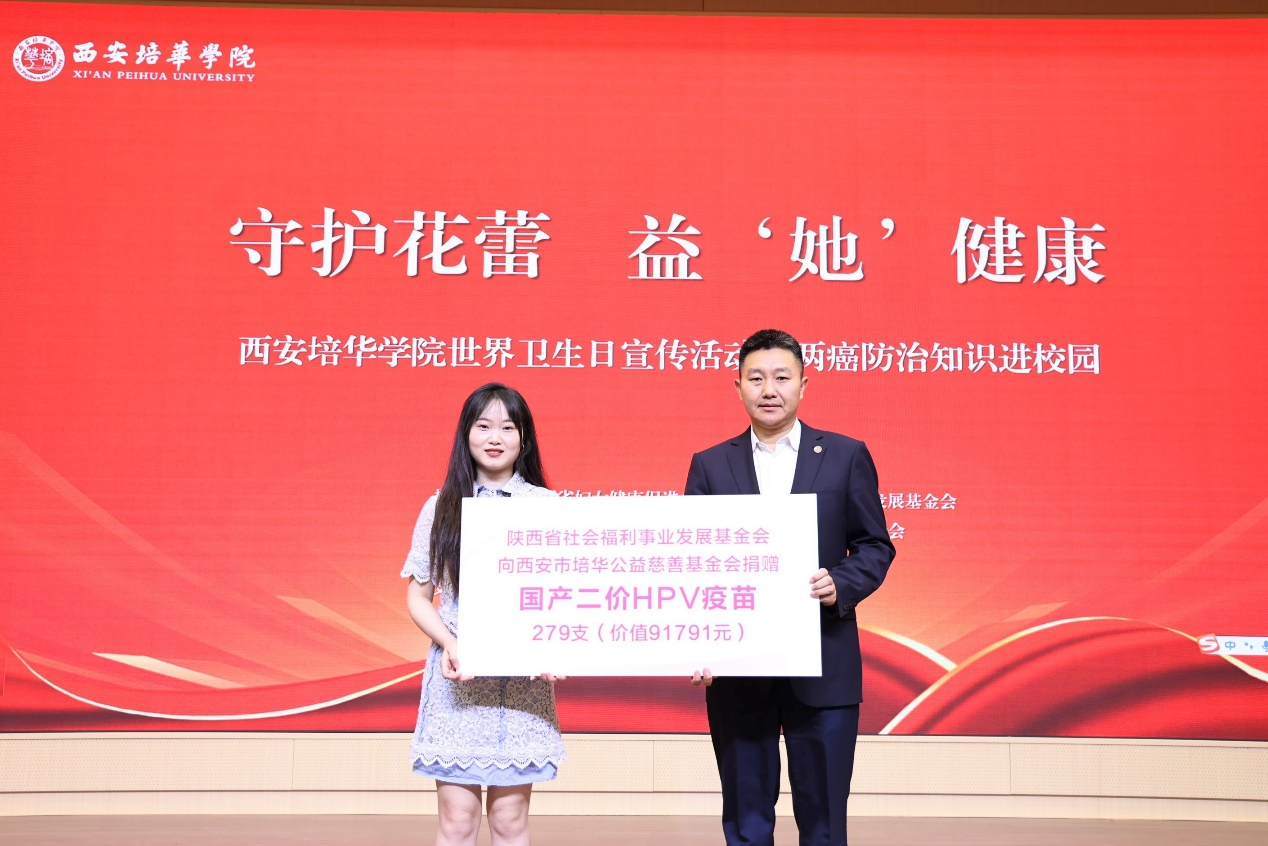 活动现场,厦门万泰沧海生物技术有限公司向西安培华学院女子学院学生捐赠价值玖万壹仟柒佰玖拾壹元(279支)的二价HPV疫苗。公司西北大区负责人王美玲表示,高校在健康科普中作用重大,此次捐赠是希望回馈社会,助力西安培华学院打造女性健康教育的示范项目,企业愿与高校携手,为女性健康事业贡献力量!