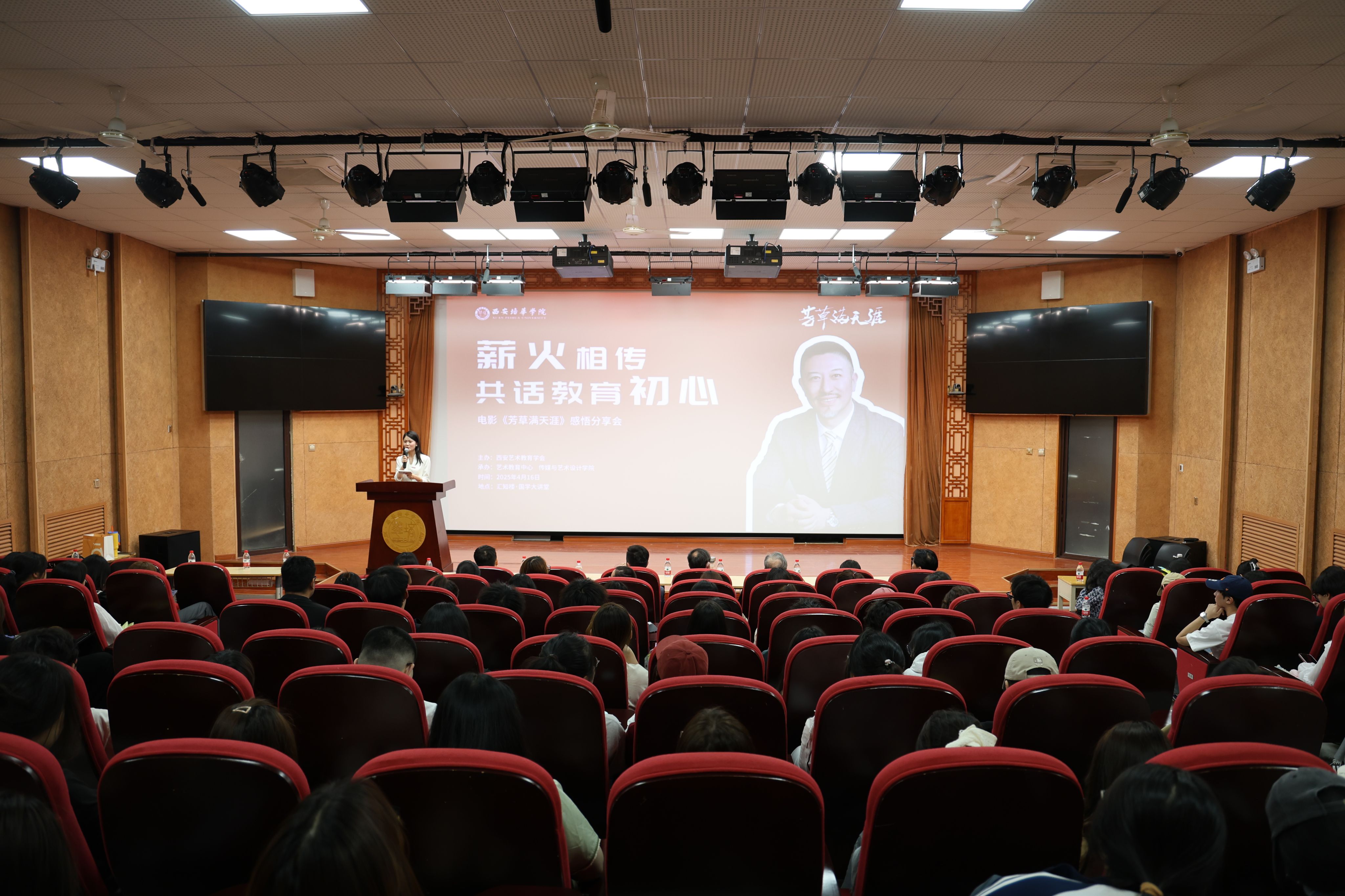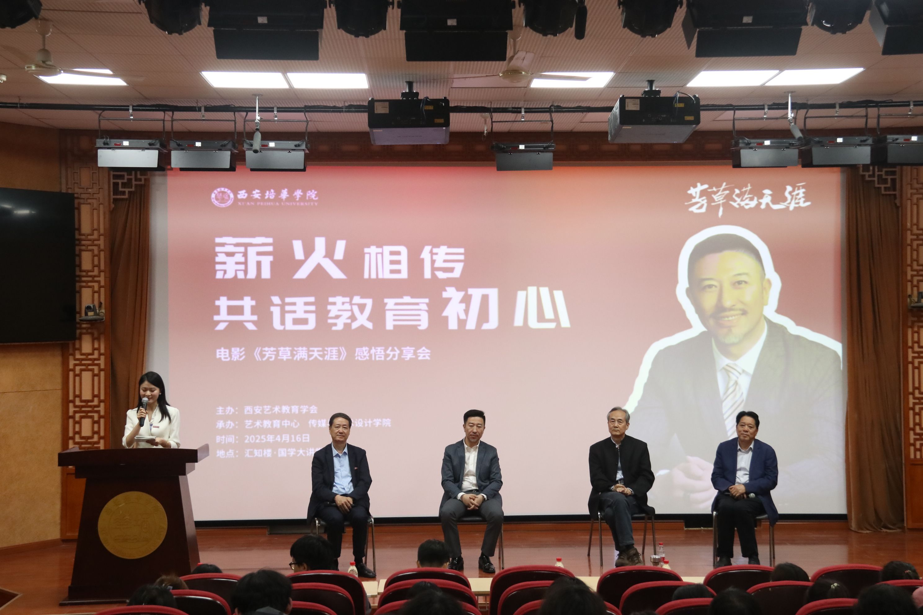 为弘扬新时代教师立德树人精神,营造尊师重教氛围,激励教育工作者投身教育强国实践,4月16日下午,由西安艺术教育学会主办的电影《芳草满天涯》感悟分享会在西安培华学院国学大讲堂举行。陕西籍知名电影导演肖齐、传媒与设计学院常务副院长徐莹、艺术教育中心主任刘荣弟教授、人文与国际教育学院仵埂教授、传媒与设计学院戏剧影视文学专业负责人周满强副教授及百余名师生代表参加活动,共同感悟乡村教师扎根教育的温情与力量。