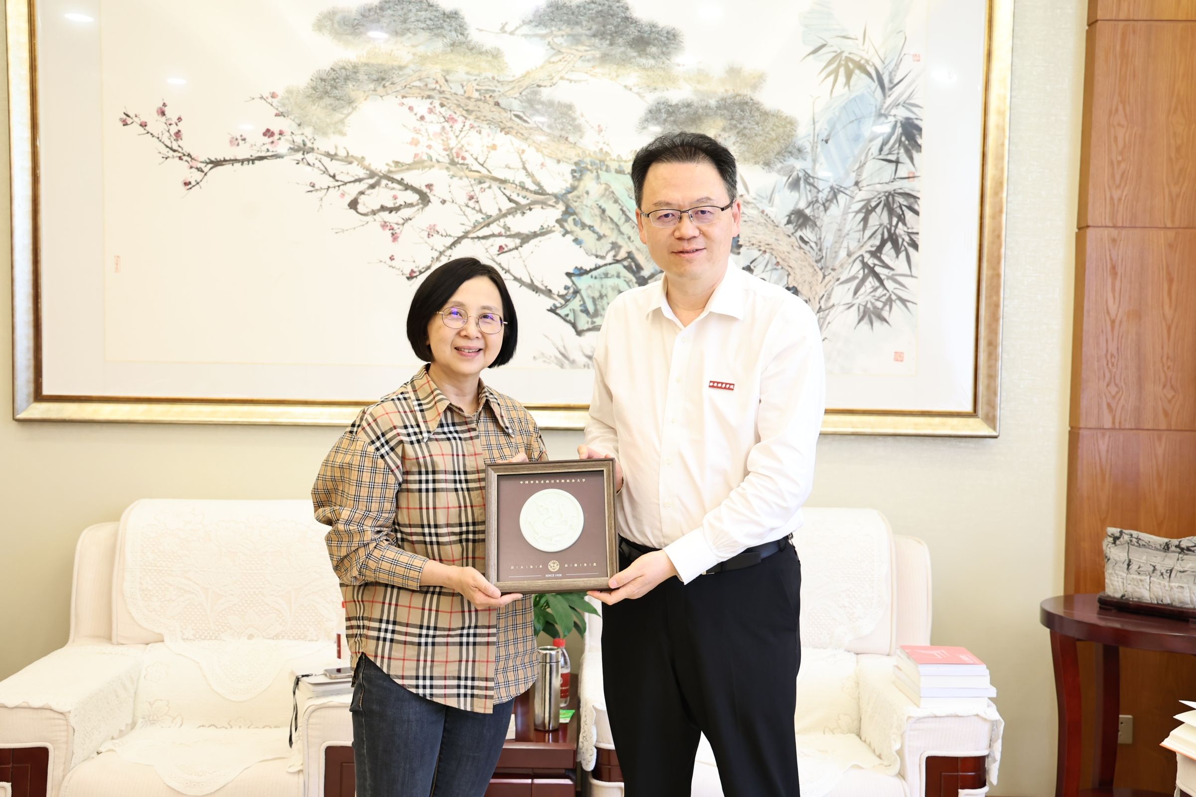 西安培华学院理事长姜波赠送礼物给中国妇女出版社总编辑廖晶晶