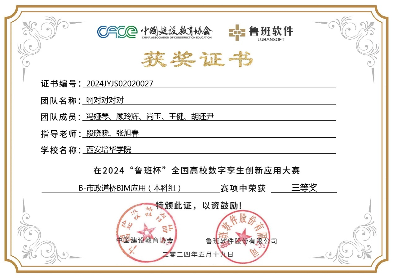 近日,中国建设教育协会举办的2024“鲁班杯”全国高校数字孪生创新应用大赛圆满落下帷幕。在此次赛事中,智能科学与工程学院邀请陕西建工第十一建设集团张旭春、中国建筑第七工程局王延博担任企业导师,师生高度重视,积极备赛,齐心协力、精诚合作,最终斩获国家级团体三等奖4项。段晓晓、翟颖、张旭春、王延博4名教师获得“优秀指导教师”的荣誉称号。