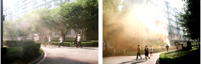 下午16时30分,随着模拟火灾警报的响起,17号公寓楼浓烟滚滚,工作人员广播提醒,各楼层同学们按照疏散路线,迅速有序撤离至楼下安全地带。
