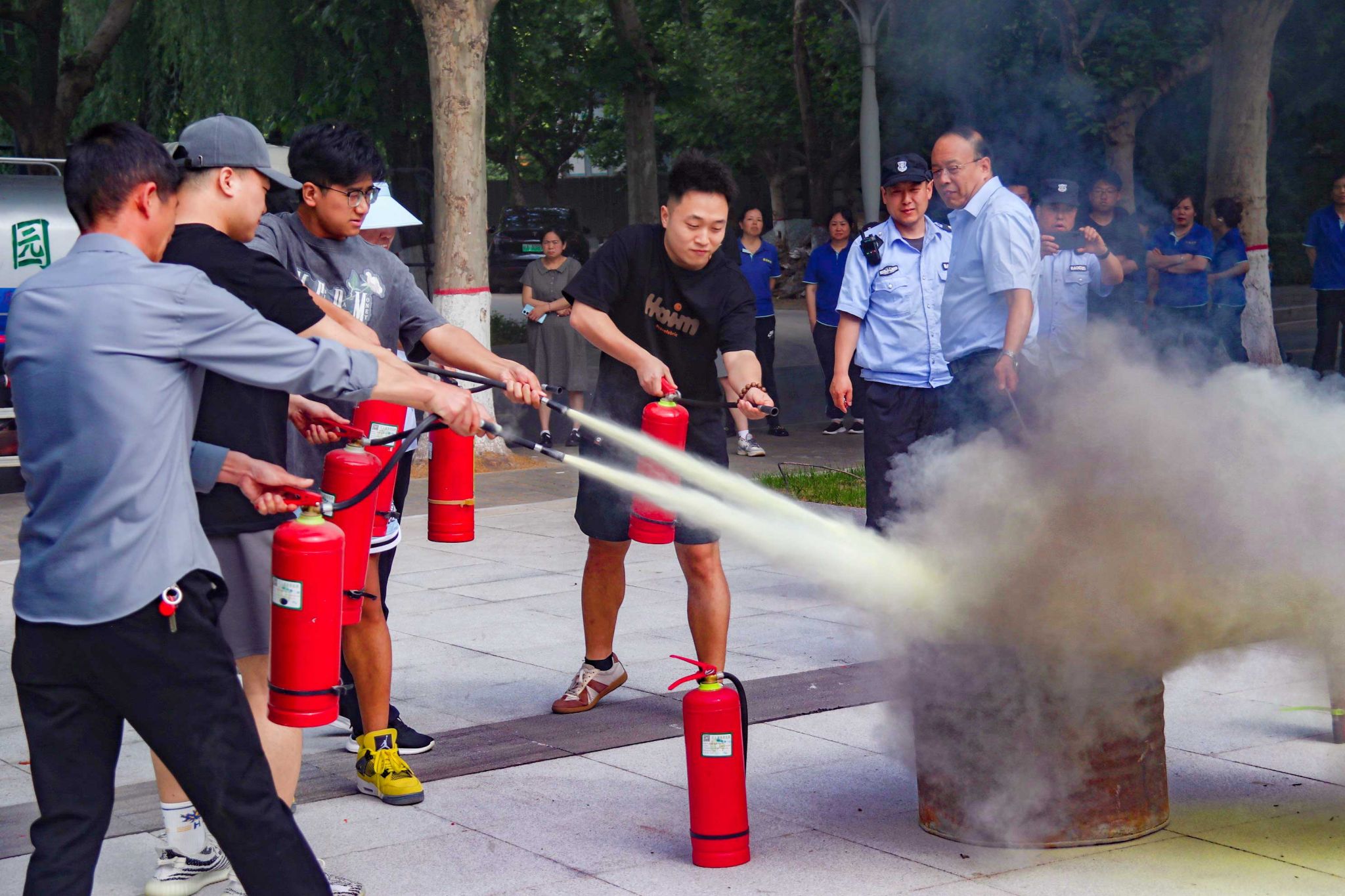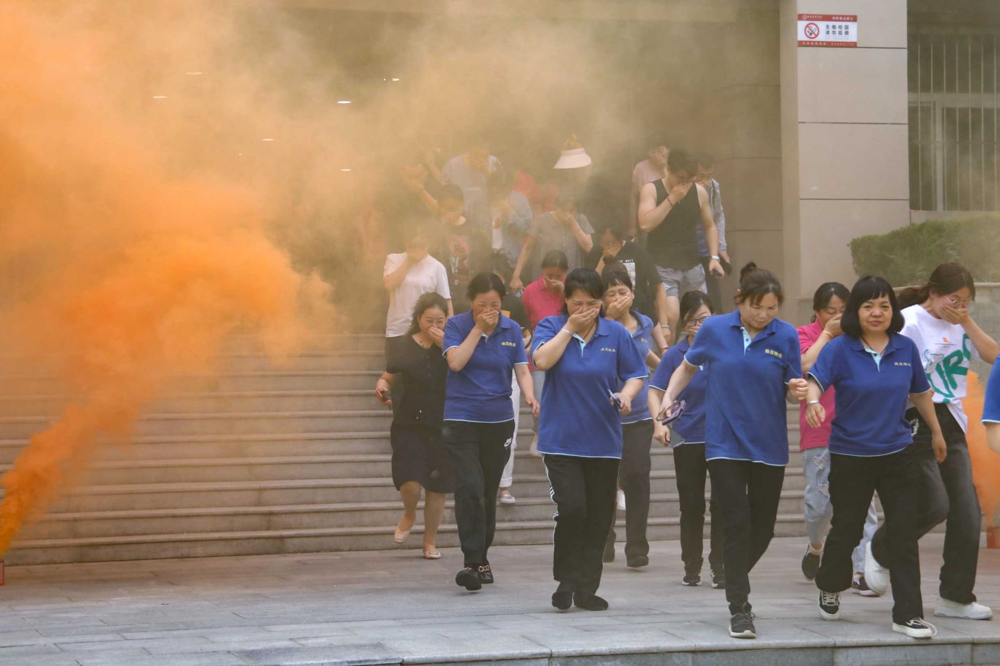讲座结束后,在场师生按照指令进行了疏散演练。随着总指挥一声令下,急促的消防警笛鸣起,通讯组、疏散抢救组、灭火组迅速进入各自战位,断电、控制火情。师生代表在楼层疏散引导员的指挥下,低伏姿势捂住口鼻,沿着指定的疏散路线快速、有序地向格物楼东边区域撤离。100秒内,师生全部有序撤离至安全地带。5分钟后明火被扑灭,总指挥清点人数确认全体师生安全后,演练结束。