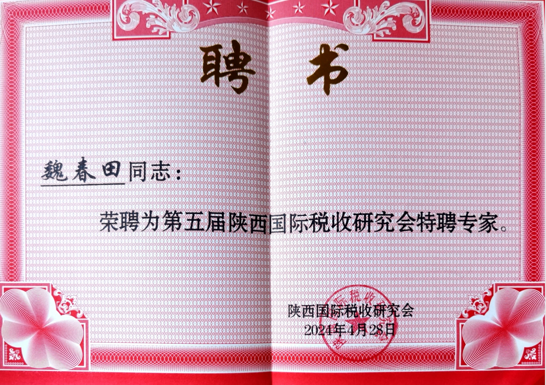 4月28日举,第五届陕西国际税收研究会换届大会举行,学校法学院院长王鸿貌教授、法律实务教研室魏春田教授被聘为研究会特聘专家。
