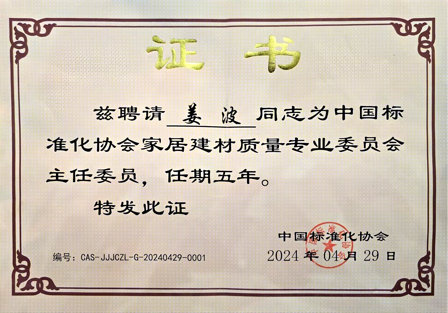 理事长姜波被聘为中国标准化协会家居建材质量专委会主任委员