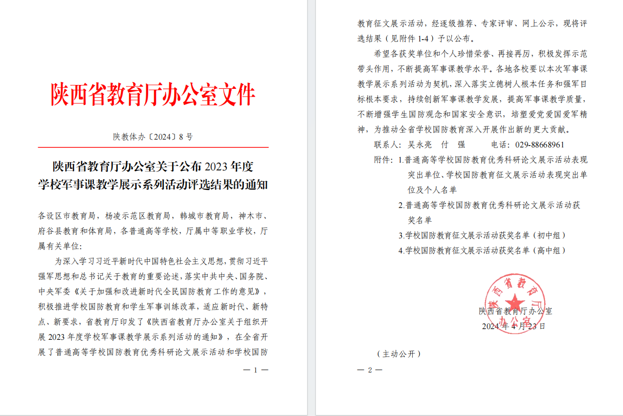 近日,陕西省教育厅办公室公布了《关于2023年度学校军事课教学展示系列活动评选结果的通知》,西安培华学院学生服务中心军事理论教研室副主任王宏社副教授的论文《提质普通高等学校国防教育应抓好“四全”》荣获普通高等学校国防教育优秀科研论文三等奖,实现了学校自军事理论教研室组建并参赛以来获奖零的突破。