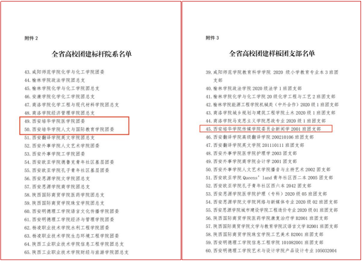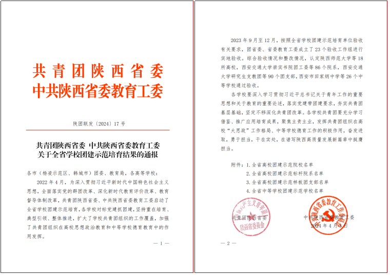 近日,共青团陕西省委、中共陕西省委教育工委联合下发《关于全省学校团建示范培育结果的通报》,学校多个院系、团支部顺利通过验收。其中,人文与国际教育学院团委,医学院团委获批全省高校团建标杆院系,传媒学院(现传媒与设计学院)新闻学2001班团支部获批全省高校团建样板团支部。