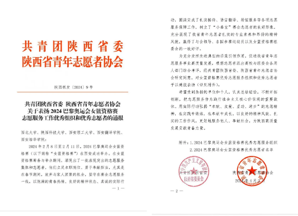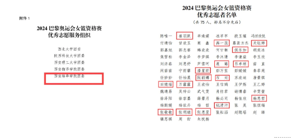 近日,共青团陕西省委、陕西省青年志愿者协会发布《关于表扬2024巴黎奥运会女篮资格赛志愿服务工作优秀组织和优秀志愿者的通报》,学校团委荣获2024巴黎奥运会女篮资格赛优秀志愿服务组织,侯乐如等16名同学荣获2024巴黎奥运会女篮资格赛优秀志愿者荣誉称号。