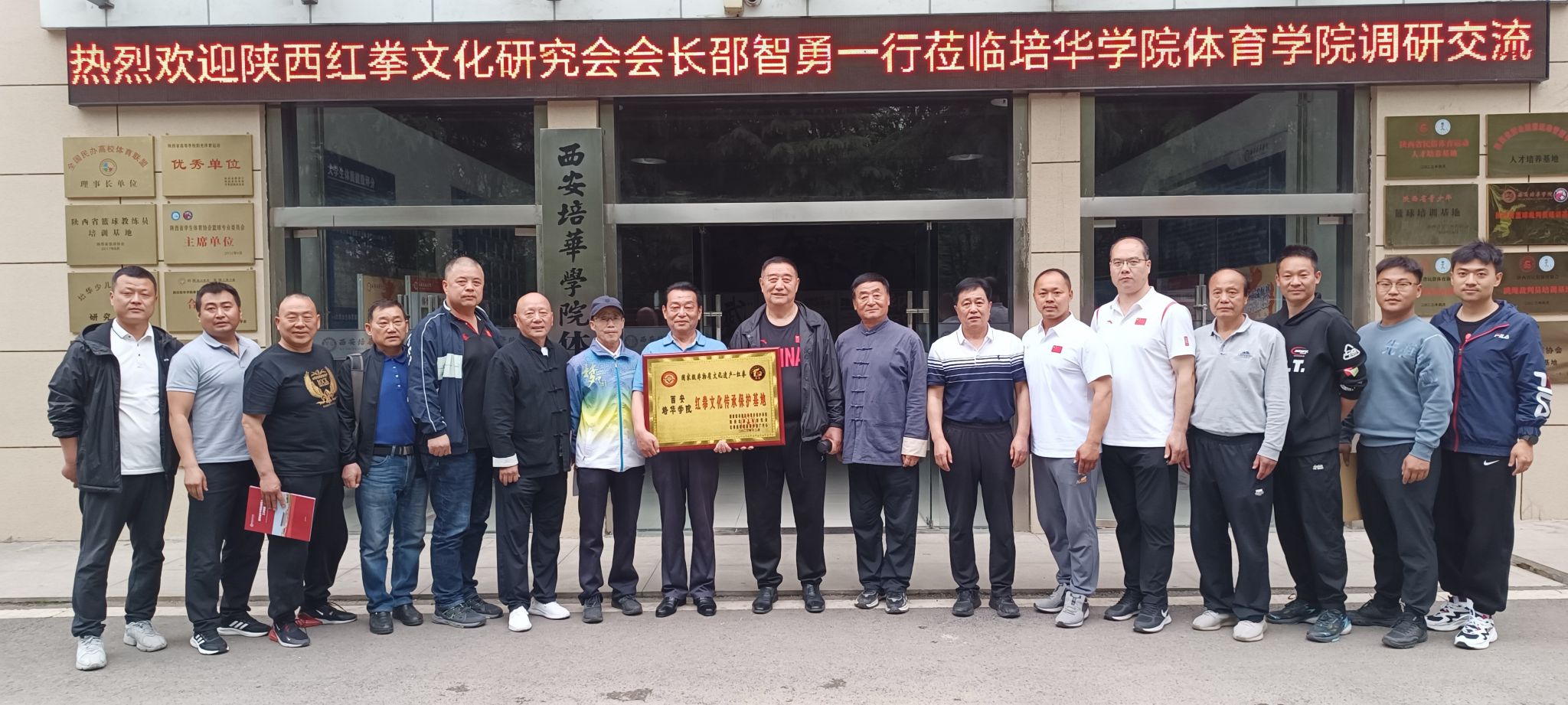 陕西红拳文化研究会会长、红拳国家级代表性传承人邵智勇,陕西红拳文化研究会秘书长、红拳省级代表性传承人田琨,陕西红拳文化研究会监事会主席杨朝华,陕西红拳文化研究会常务副会长、西安外国语大学红拳高校科研保护推广中心主任卢佳,陕西红拳文化研究会副会长、红拳省级代表性传承人党选民,陕西红拳文化研究会副会长孙顺喜、赵国民,陕西红拳文化研究会办公室主任蔡永红,陕西红拳文化研究会副秘书长、马场小学校长杨军,陕西日报记者周恒宇;西安培华学院监事会主席、校工会主席、校体育工作委员会主任徐国富,西安培华学院体育学院院长王志强,体育学院党总支书记、行政副院长马德厚等人出席本次仪式。