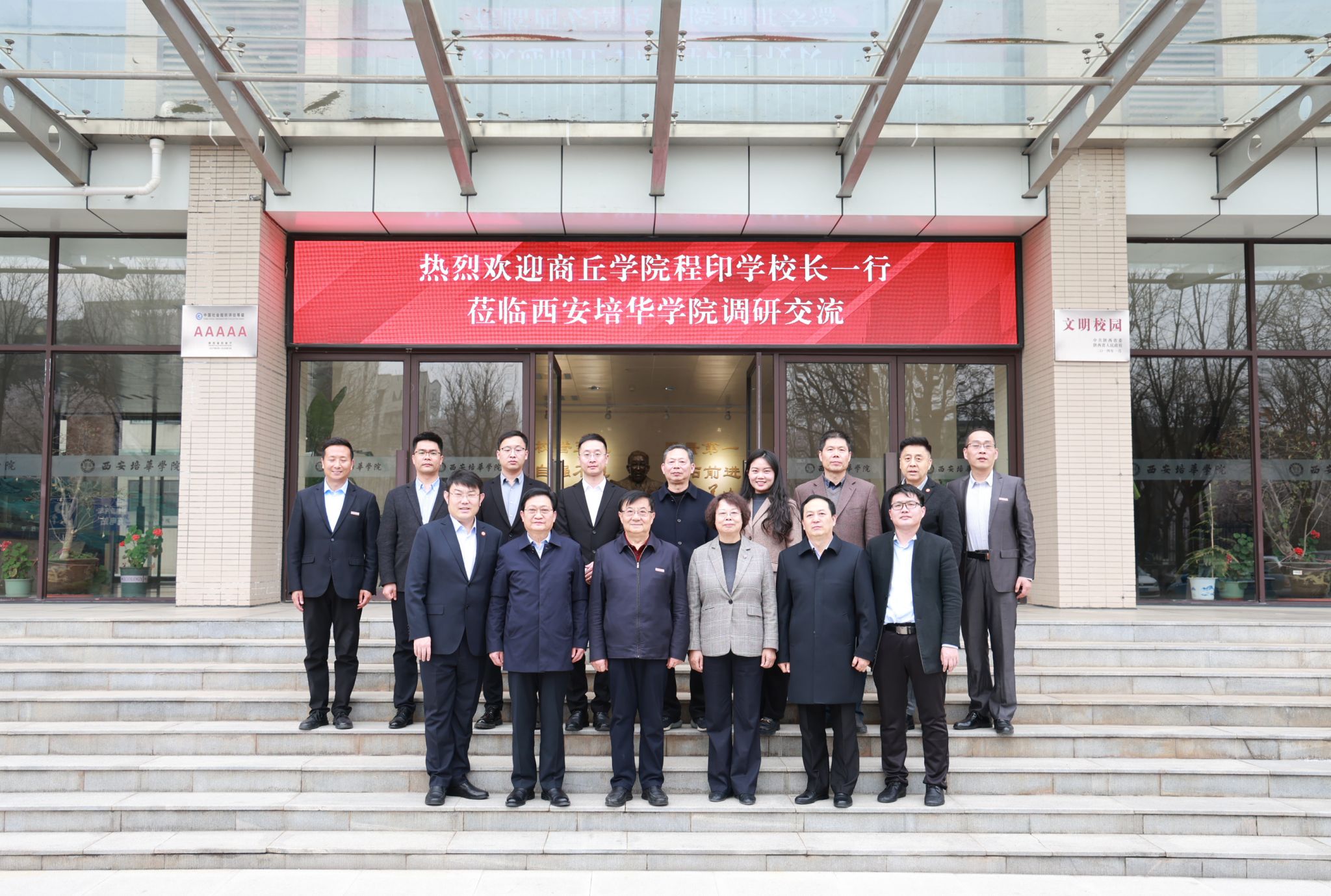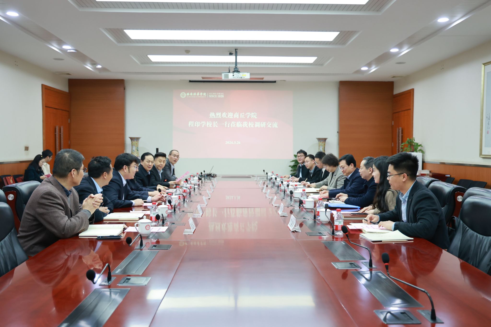 3月26日下午,商丘学院校长程印学一行8人来培华调研交流。学校校长李映方、常务副校长胡俊生、校长助理鲍伟、校办主任李健、发展规划与质量建设中心主任赵巍、人力资源中心主任罗北荣、教务管理中心副主任王琳参加了交流会。