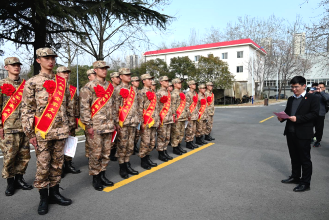 会计与金融学院张博文作为新兵代表发言,表示将发扬革命先辈的光荣传统,刻苦锻炼,在军营里绽放热血青春,实现自我价值,成就精彩人生。