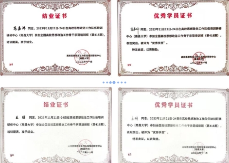 为认真学习宣传贯彻习近平新时代中国特色社会主义思想和党的二十大精神,深入实施“时代新人铸魂工程”,全面提升高校思想政治工作队伍素质能力,切实推动高校思想政治工作高质量发展,由教育部思想政治工作司主办、高校思想政治工作队伍培训研修中心(南昌大学)承办的第418期全国高校思想政治工作骨干示范培训班于11月21-24日在南昌大学举行,我校学工骨干传媒学院党委副书记高嘉炜、校团委志愿服务工作部部长王朋参加了此次培训。