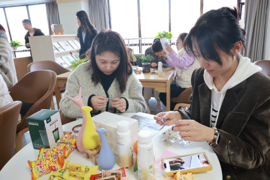 在手作小课堂,手工老师为大家讲解了朋克机器人挂件的制作流程,老师们挑选好合适的配件后进行镶嵌、装饰。在手工制作的过程中,大家仿佛化身成认真专业的手作匠人,专心致志的发挥想象和创意。