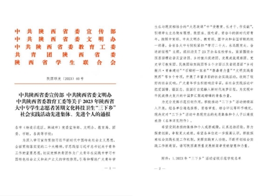 近日,中共陕西省委宣传部、中共陕西省委文明办、中共陕西省委教育工委、共青团陕西省委、陕西省学生联合会联合下发了《关于2023年陕西省大中专学生志愿者暑期文化科技卫生“三下乡”社会实践活动先进集体、先进个人的通报》。