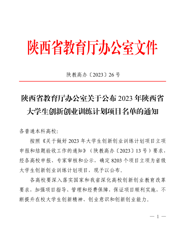 按照《关于做好2023年大学生创新创业训练计划项目立项申报和结题验收工作的通知》(陕教高办〔2023〕13号)要求,2023年“大学生创新创业训练计划项目”经过师生申报、专家指导、校内外专家评审及省级评审等环节,共有70个项目立项为省级大学生创新创业训练计划项目,现予以公布。