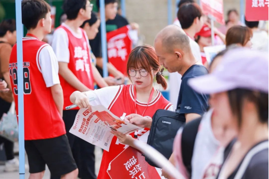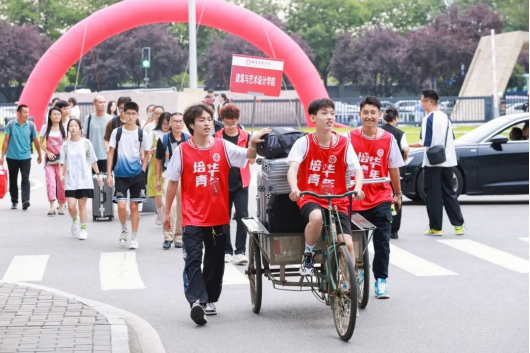 红马甲、小推车、迎新牌...,,,志愿者的身影忙碌穿梭在校园各个地方,全校上下齐动员,热情周到地迎接新同学的到来。