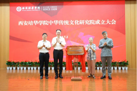 北京延安儿女联谊会会长胡木英,融道书院创始人周贵银,西安培华学院理事长姜波,校长助理张运良共同为“西安培华学院中华传统文化研究院”揭牌