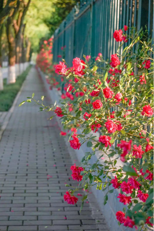五月是蔷薇盛开的季节。阳光下,培华园里,花开得红似火,艳如霞。蔷薇形态各异,千姿百态。独一朵娇艳欲滴,开一片争妍斗艳。