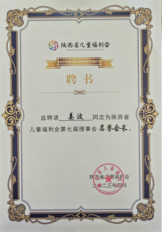 姜波当选为陕西省儿童福利会第七届理事会名誉会长