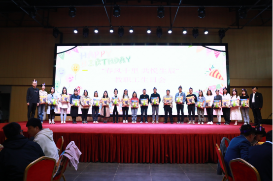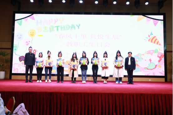 姜波理事长、李映方校长逐一为教职工送上学校精心订制的生日礼物,一份份礼物倾注了学校对教职工们浓浓的关爱和祝福。徐国富主席也为本月过生日的姜波理事长和于国亮校长赠送生日礼品,并现场献歌一曲。