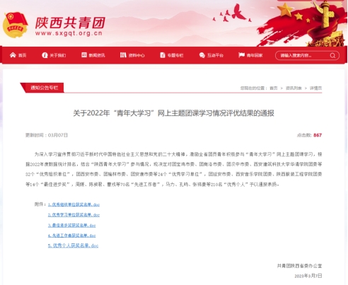 3月7日,共青团陕西省委办公室发布《关于2022年“青年大学习”网上主题团课学习情况评优结果的通报》,学校团委荣获“优秀学习单位”,校团委宣传部部长林文婷同志获评“先进工作者”称号、传媒学院赵伟龄同学、人文与国际教育学院马文文同学、建筑与艺术设计学院皮兴禹同学分别荣获“优秀个人”称号。