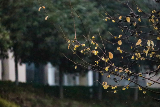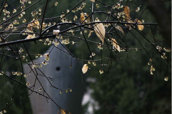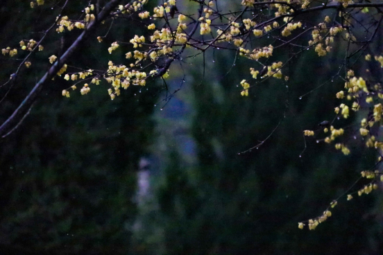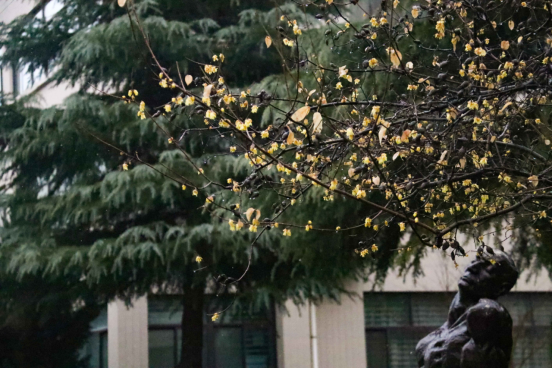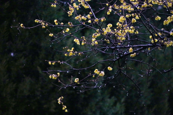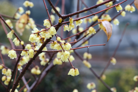 随风而至,滋润万物,无意讨好,唯有奉献。春雨中,万物生长,生命萌发,而腊梅也在雨中“肆意”绽放,洗尽铅华。