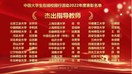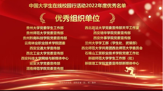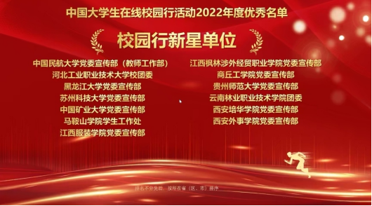 为了不断激发青年师生的热忱和活力,增强新时代高校思政工作的育人实效,涵养向上向善的校园文化,1月10日,由教育部中国大学生在线组织的“守正创新 共塑网络育人新动能新优势”2022校园号建设暨校网通站工作年会在线上举办。会议揭晓了2022年度中国大学生在线校网通及校园行活动优秀名单。其中,西安培华学院党委宣传部荣获“优秀组织单位”及“校园行新星单位”,党委宣传部教师薛超飞荣获“杰出指导教师”。