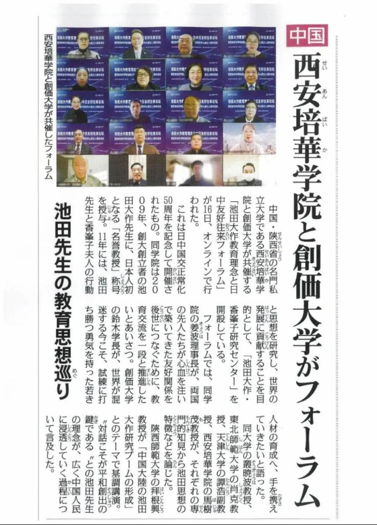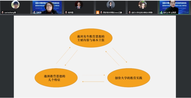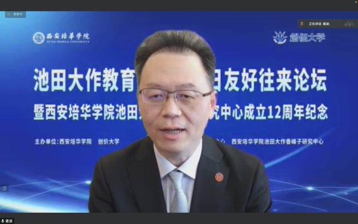12月16日下午,池田大作教育理念与中日友好往来线上论坛顺利举行。来自西安培华学院、创价大学、陕西师范大学、东北师范大学、天津大学的校领导及专家学者齐聚云端,共同研究池田大作教育理念,交流池田大作先生关于中日友好精神的相关论述,探讨中日高校合作新模式。