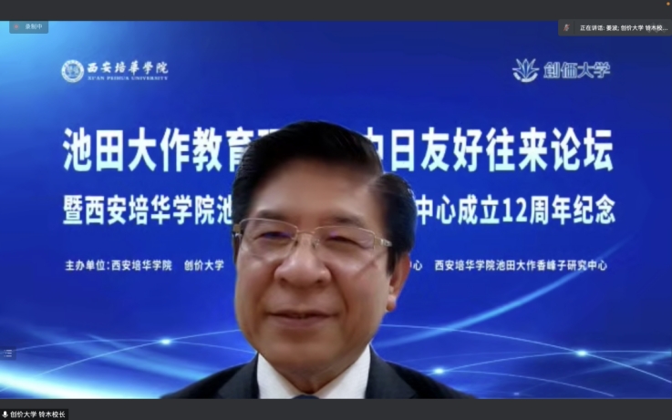 姜波理事长表示,池田大作先生作为西安培华学院名誉教授、其夫人香峰子女士作为西安培华学院女子学院的名誉院长为中日友好事业做出了杰出贡献,为培华学院与创价大学长期保持友好合作关系奠定了良好基础。此次论坛的举办正值中日邦交正常化50周年,期待中日双方高校不断传承与发展池田大作教育理念和中日友好往来精神,加速培华与创价大学的交流与合作,期待两校师生再次交流互访,并请铃木校长代为转达对池田大作先生及夫人的问候与祝福,祝愿本次论坛圆满成功。