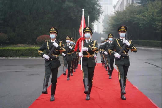 西安培华学院国旗护卫队在学校南门举行升国旗仪式,升国旗前,国护队同学集体观看了天安门广场升旗直播,向祖国致以最崇高的敬意。