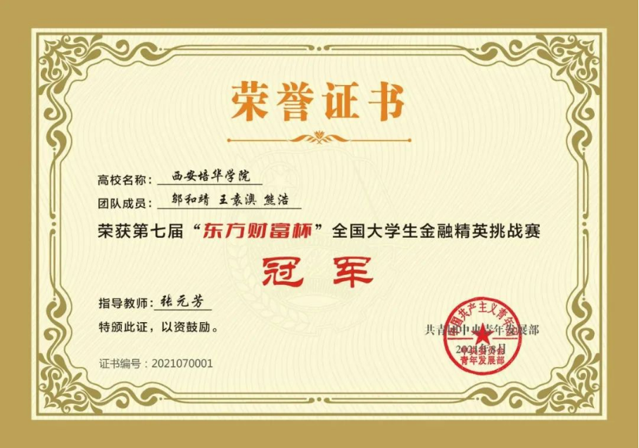 在由共青团中央青年发展部主办的第七届“东方财富杯”全国大学生金融精英挑战赛中,西安培华学院会计与金融学院的战队技压群雄,问鼎冠军!