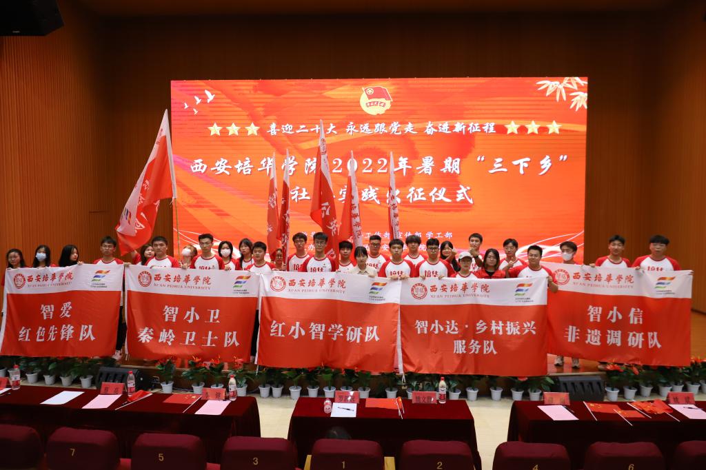 出征仪式现场展播了2021年西安培华学院社会实践“三下乡”《一路生花,青春绽放》;校团委杨媛老师宣读《关于成立西安培华学院2022年度暑期“三下乡”社会实践团队的通知》;参会嘉宾分别为2022校级重点立项团队、2022校级重点立项团队、2022校级重点立项团队授旗。
