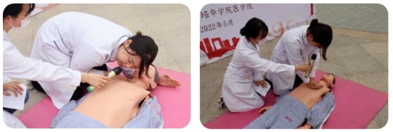 学生代表对现场同学们进行心肺复苏(CPR)急救教学