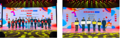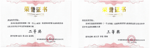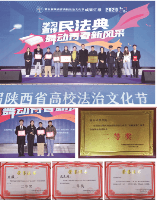 启动仪式上,表彰了陕西省第九届高校法治文化宣传季青少年法治短视频大赛、优秀法治文化作品、优秀组织单位等获奖单位和个人。西安培华学院选送的短视频《第一百八十四条》获青少年法治短视频大赛二等奖,《一千五预算》获青少年法治短视频大赛三等奖,学校荣获“优秀组织单位”奖。